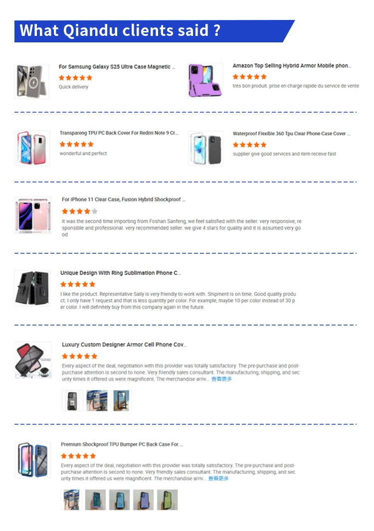 Advantage: | 1. All phone case tested by real phone. 2. Factory competitive price. 3. Professional QC team. 4. Strict test with inspection machine and inspection before shipping. |