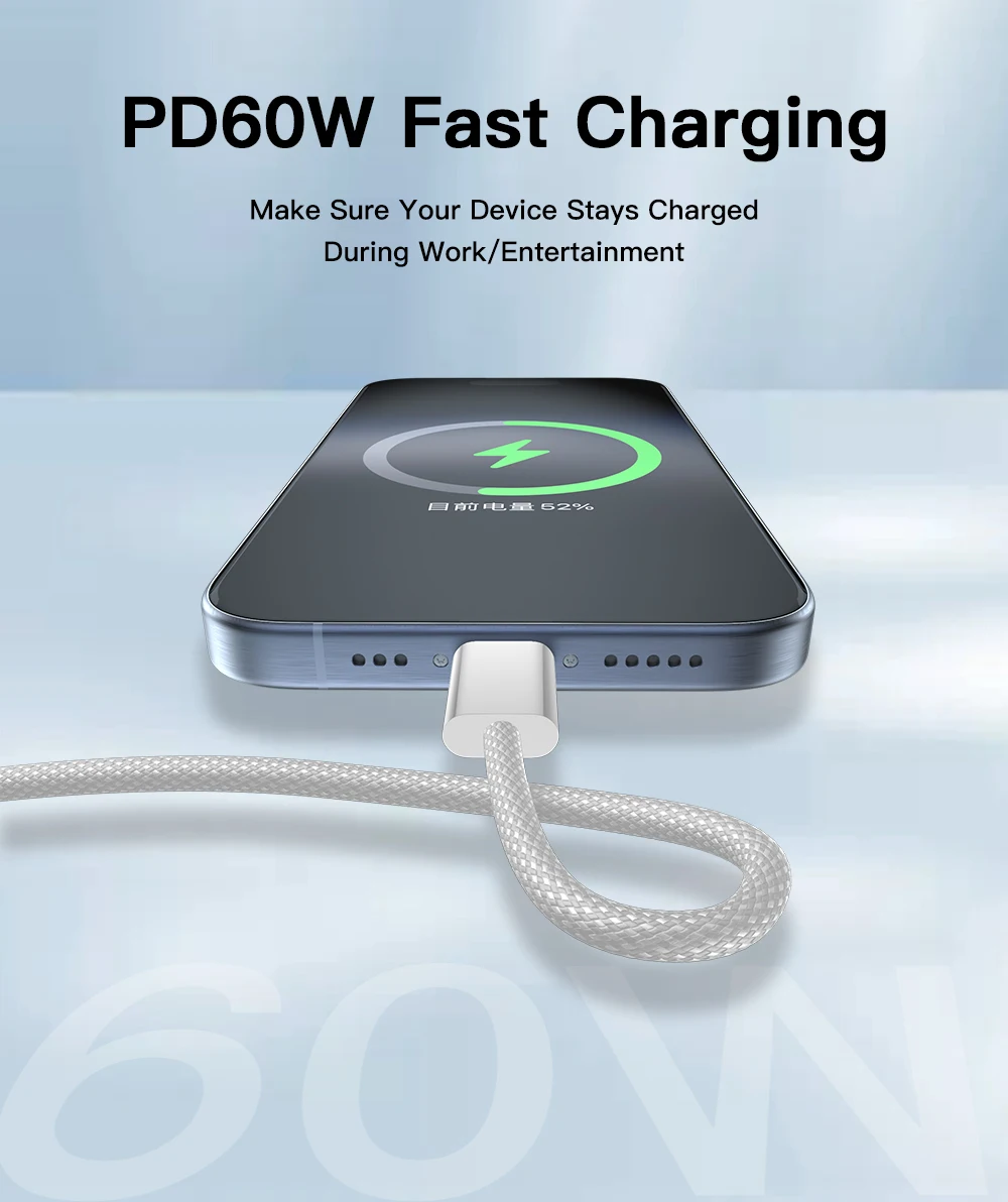 UNIEAN Wholesale High Quality Nylon Type C Cable PD 60W Fast Charging USB C Data Cable for iPhone